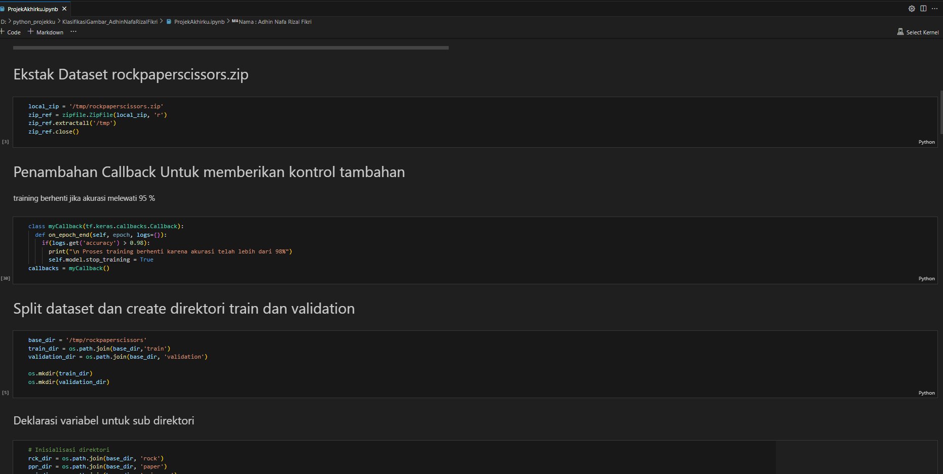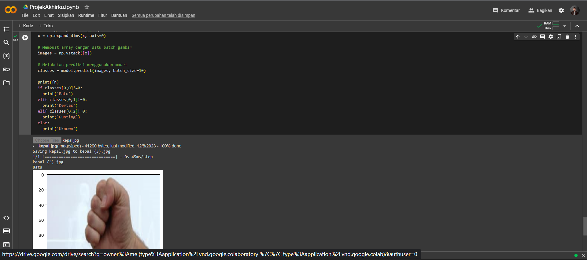 The project contains machine learning for the image classification process to predict rock paper scissors using hand gestures, developed in python language and is my final project in the Machine Learning class for beginners organized by Dicoding.